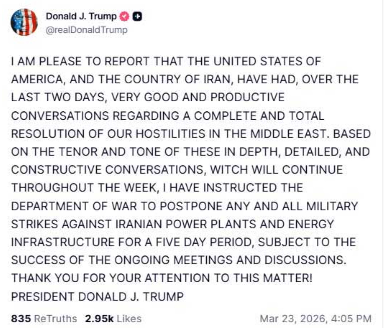 So, President Trump claimed in a post on Truth Social, (written in CAPS), that negotiations were held this past Sunday and Monday between the US and Iran, and were “VERY GOOD AND PRODUCTIVE,” focusing on a 15-point plan sent to Iran via Pakistan. Trump noted the primary point is an Iranian commitment to forgo nuclear weapons, stating, “If they carry through with that, it’ll end that problem.” He also said that he had told the Department of War to postpone strkes against Iran’s power plants and energy infrastructure for five days.